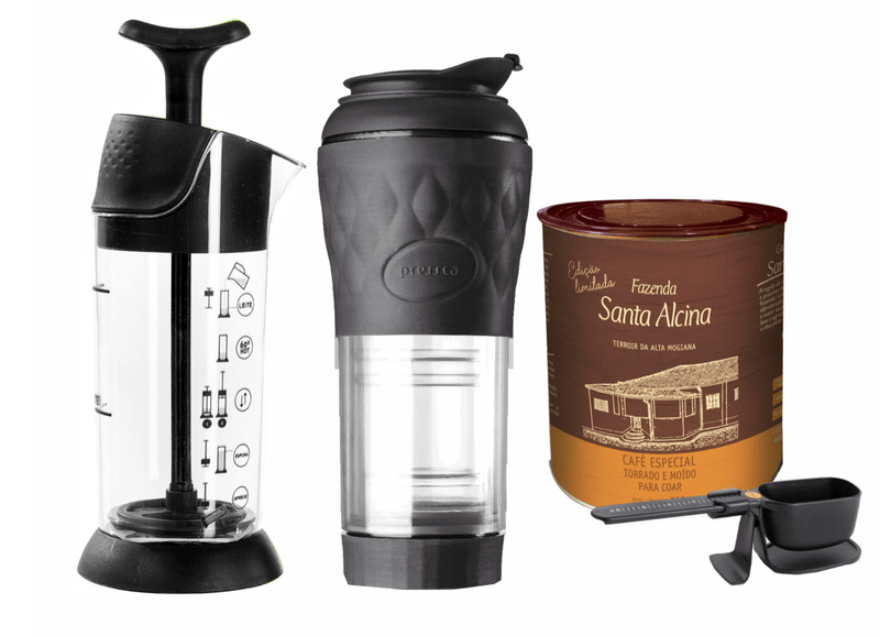 Kit Cafeteira Portátil Pressca, Balança dose Certa, Espumador de Leite e Café Santa Alcina lata 250grs