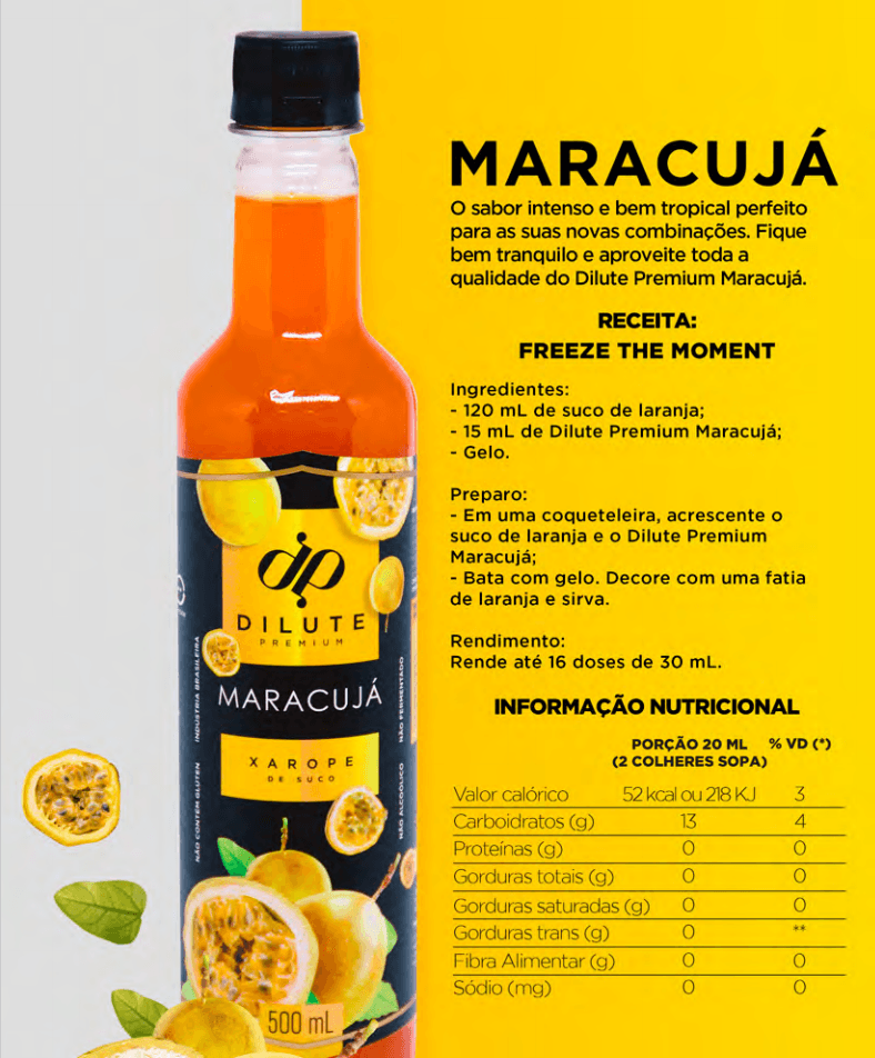 Com Suco concentrado de polpa, o Dilute Premium de Maracujá é um dos sabores que veio com tudo para ficar! Surpreenda-se com o sabor incrível dessa versão!